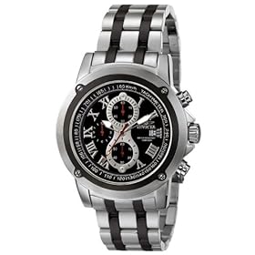 Distinctive masculine details and multiple complications give this Invicta chronograph watch timeless appeal. This elite timepiece features the cool, contrasting look of black ionic-plating and silver-tone stainless steel on its 22-millimeter-wide band.